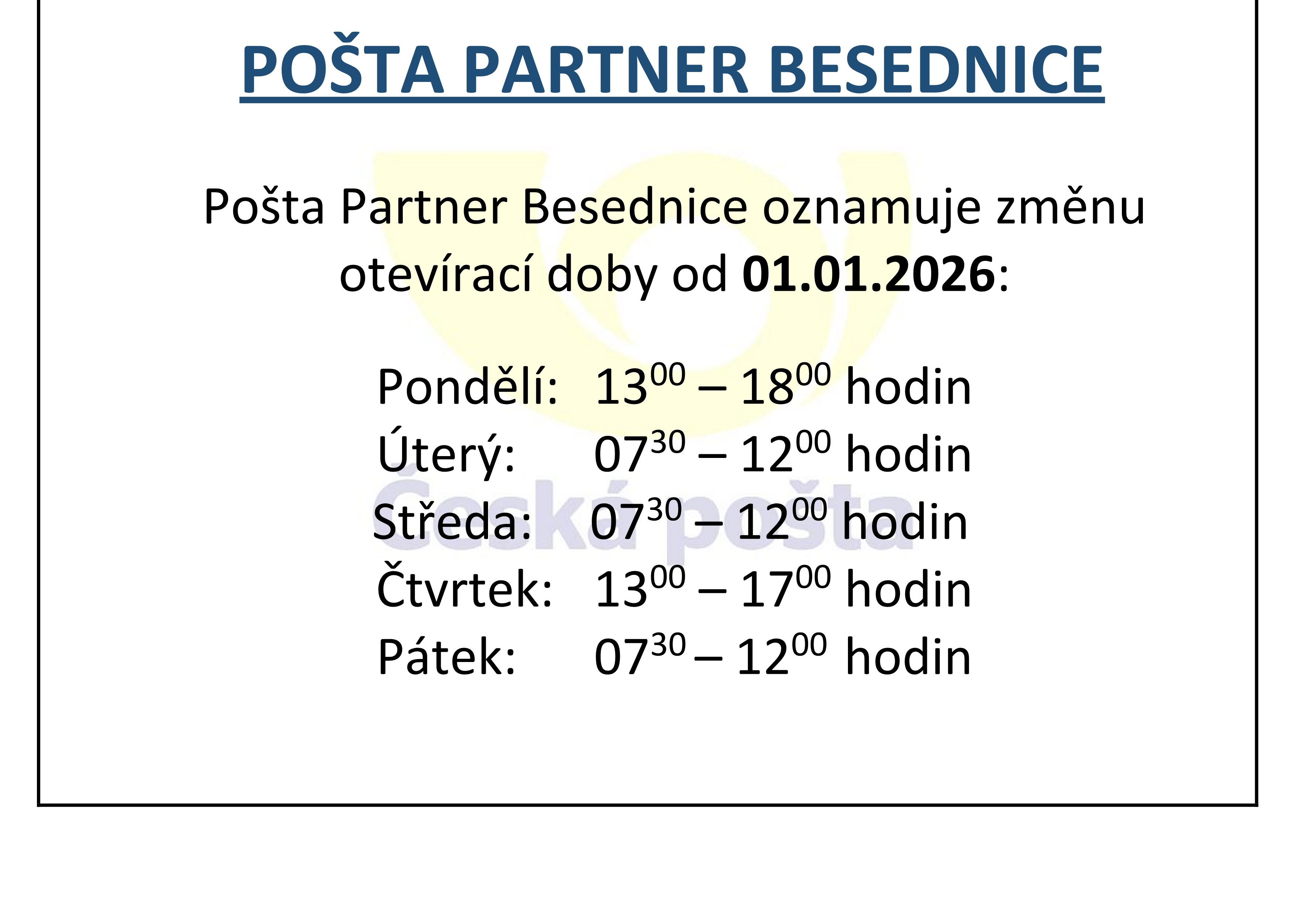 Pošta Partner Besednice - Otevírací doba od 01.01.2026 1.1.2026 Vystavil: Tomáš Mocek Sdílet Sdílet Klikněte pro zkopírování URL Facebook Pošta Partner Besednice oznamuje změnu otevírací doby od 01.01.2026